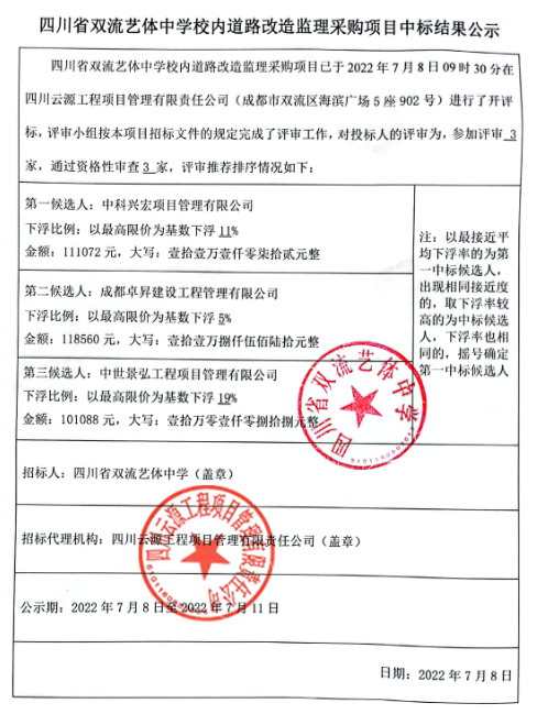 四川省双流艺体中学校内道路改造监理采购项目中标结果公示