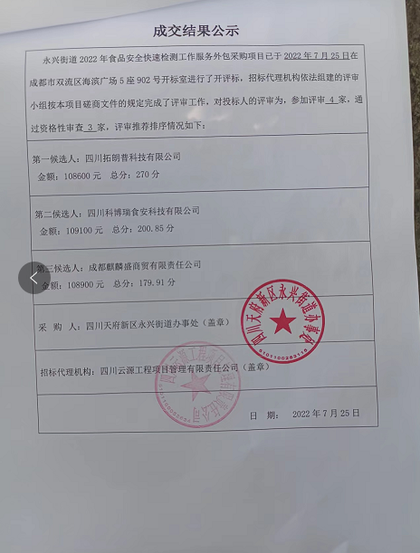 永兴街道2022年食品安全快速检测工作服务外包采购项目结果公告