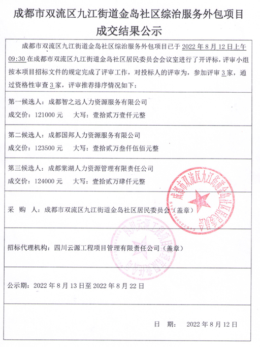 成都市双流区九江街道金岛社区综治服务外包项目成交结果公示