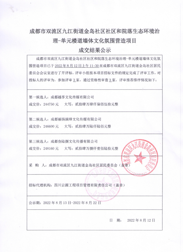 成都市双流区九江街道金岛社区社区和院落生态环境治理-单元楼道墙体文化氛围营造项目结果公示