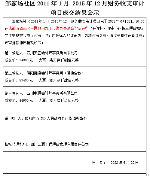 邹家场社区2011年1月-2015年12月财务收支审计项目成交结果公示