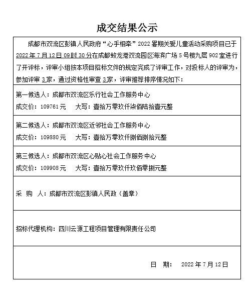 成都市双流区彭镇人民政府“心手相牵”2022暑期关爱儿童活动采购项目成交结果公示