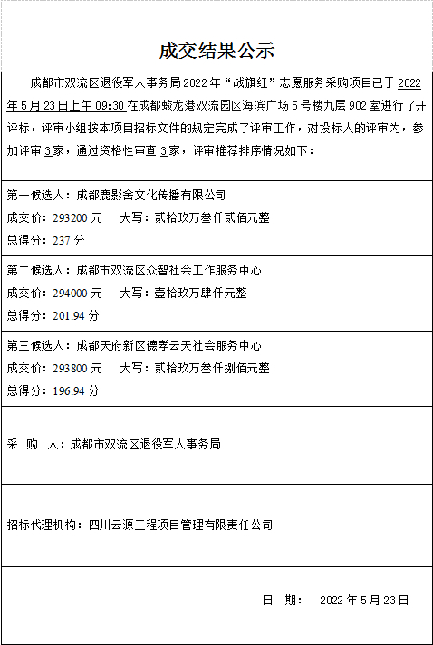 成都市双流区退役军人事务局2022年“战旗红”志愿服务采购项目结果公告
