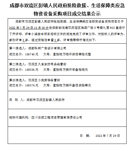 成都市双流区彭镇人民政府抢险救援、生活保障类应急物资设备采购项目成交结果公示