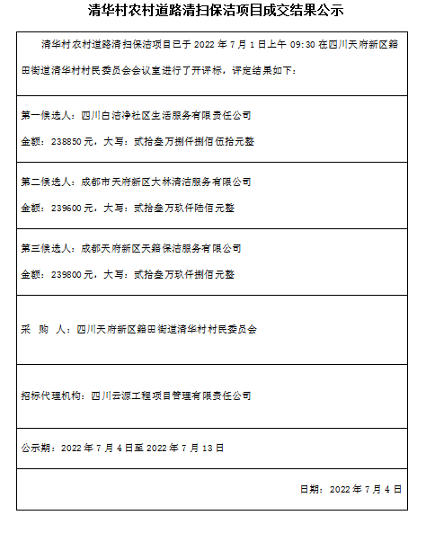 清华村农村道路清扫保洁项目结果公示
