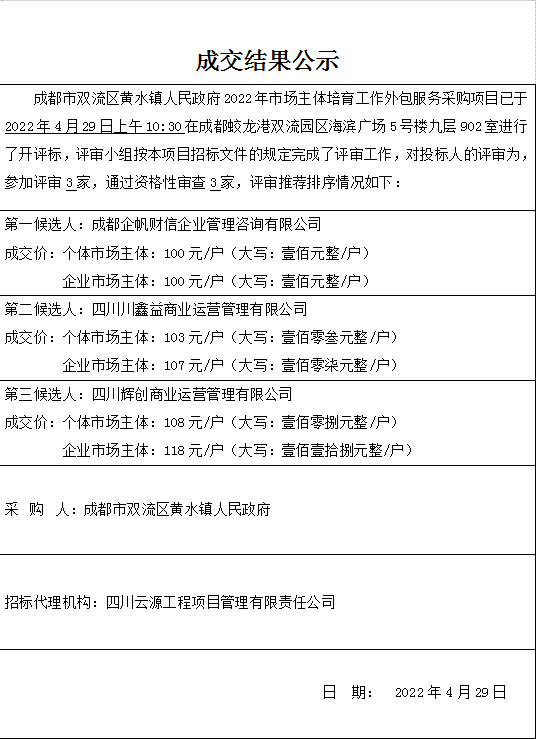 成都市双流区黄水镇人民政府2022年市场主体培育工作外包服务采购项目结果公告