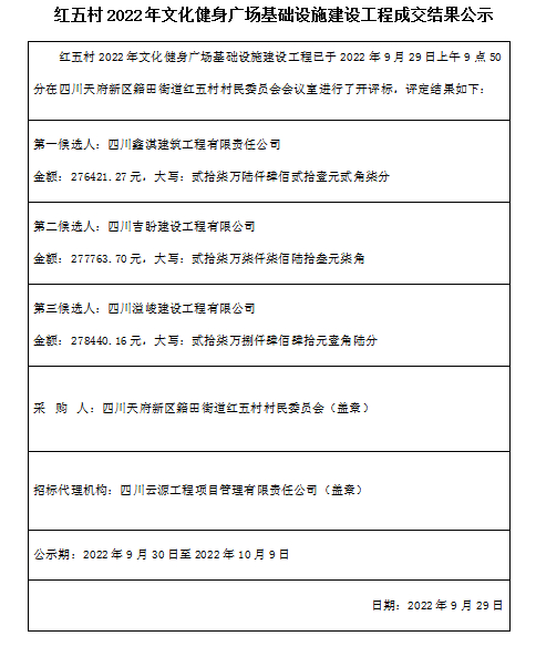 红五村2022年文化健身广场基础设施建设工程成交结果公示