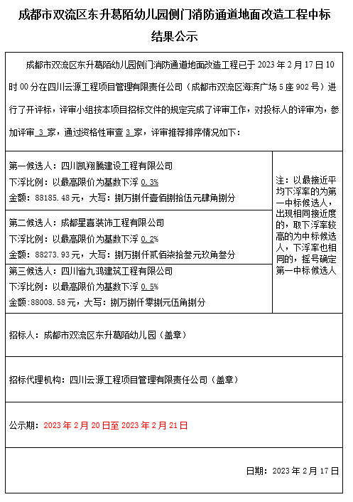 成都市双流区东升葛陌幼儿园侧门消防通道地面改造工程中标结果公示