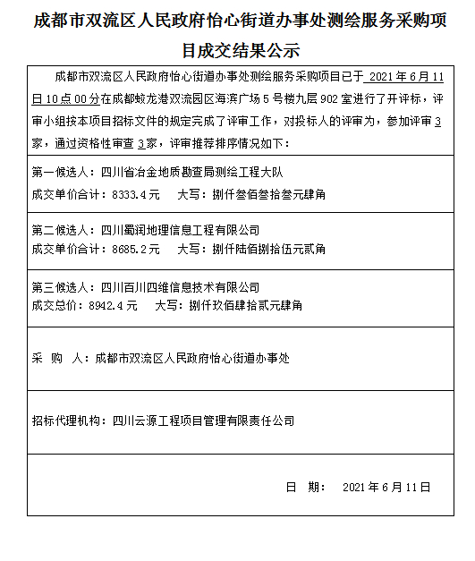 成都市双流区人民政府怡心街道办事处测绘服务采购项目成交结果公示