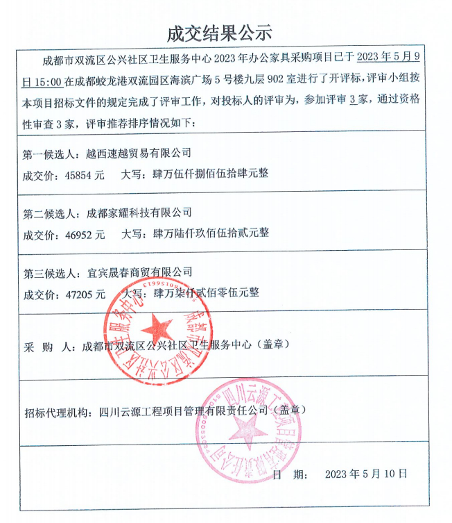 成都市双流区公兴社区卫生服务中心2023年办公家具采购项目成交结果公示